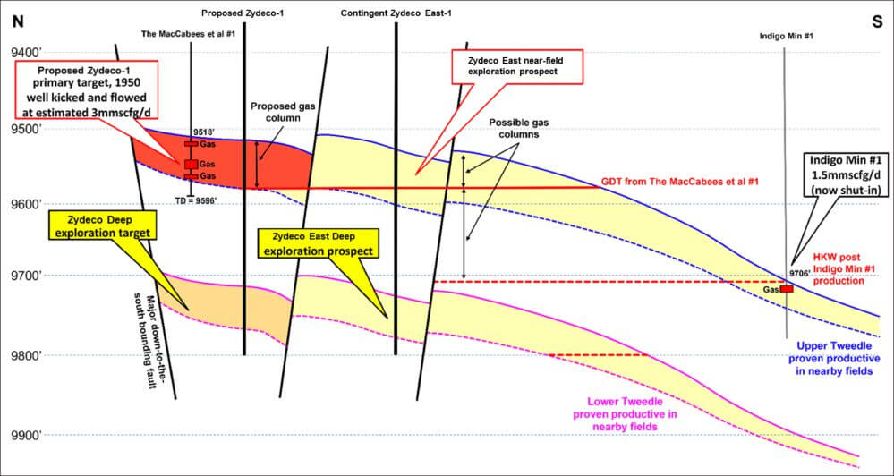 Upper Tweedle Fm. – The Upper Tweedle Fm. is proven productive at near offset fields Indigo Min (2km south) and Frey (8km east).  The reservoir was previously drilled on the structure in 1950, by The MacCabees et al #1 well, which intersected gas in the Upper Tweedle Fm but never produced from that interval, instead completing, and producing from a shallower oil reservoir.  The Zydeco-1 well will re-drill the Upper Tweedle Fm for production.